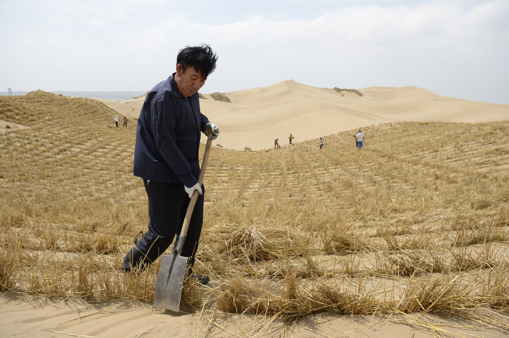 在宁夏灵武市白芨滩国家级自然保护区,王有德在治沙一线扎草方格(2013年7月24日摄)。新华社记者 王鹏 摄