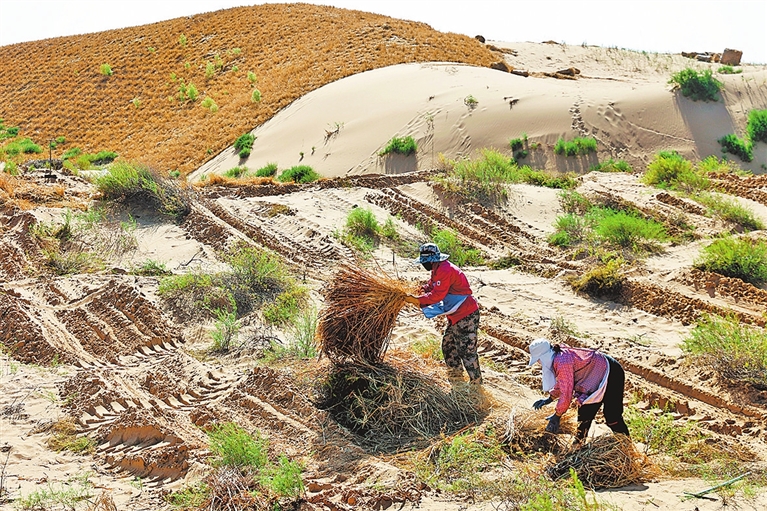 鄂尔多斯市鄂托克旗境内的毛乌素沙地上风口阻隔带北段沙化土地综合治理项目区,工人们正在用草方格锁住流沙。内蒙古日报供图