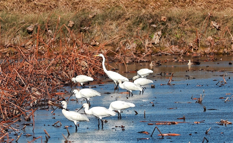在陕西黄河湿地省级自然保护区大荔段,8只白琵鹭和1只大白鹭在莲藕地里休憩。陕西日报供图
