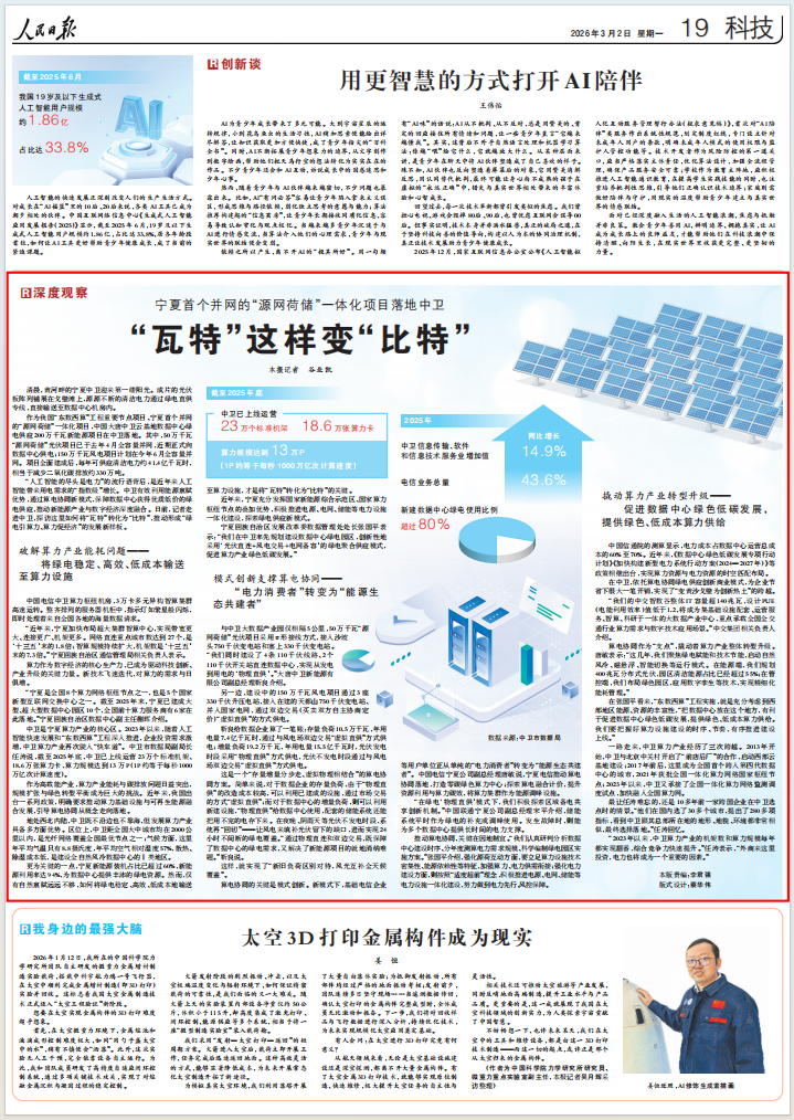 “人工智能的尽头是电力”的流行语背后,是近年来人工智能带来用电需求的“指数级”增长。中卫有效利用能源禀赋优势,通过算电协同新模式,保障数据中心获得优质低价的绿电供应,推动新能源产业与数字经济深度融合。日前,记者走进中卫,探访这里如何将“瓦特”转化为“比特”,推动形成“绿电引算力、算力促经济”的发展新样板。