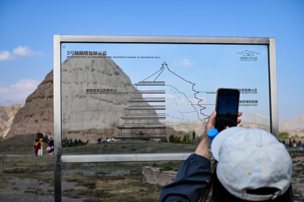游客透过复原西夏陵陵塔轮廓的亚克力板拍照打卡。新华社记者冯开华 摄