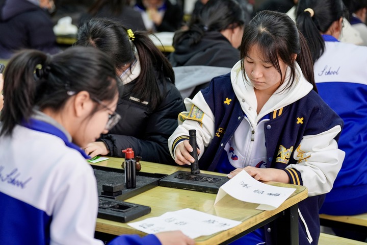 学生在西夏陵体验木活字印刷西夏文。新华社记者 杨植森 摄