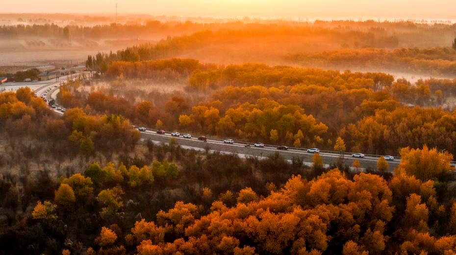 每年10月下旬至11月初,是新疆喀什地区莎车县叶尔羌河流域胡杨林最佳观赏期。金色胡杨与蓝天、碧水以及翩飞其间的鹭鸟构成一幅动人的生态画卷。