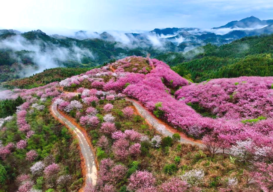 3月1日,福建省大田县屏山乡仙居山樱花竞相绽放,景致美不胜收。近期,大田县多处樱花园迎来最佳观赏期,漫山樱花如绯红云霞,与青山翠柏相映成趣,吸引不少游客前来踏青赏花、拍照打卡。