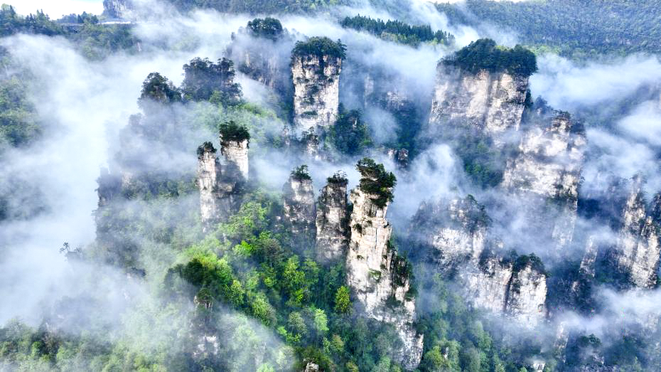 4月16日,湖南张家界武陵源天子山景区迎来春日云瀑盛景。连绵不绝的云瀑如银河倾泻,在千峰万壑间奔涌翻腾,将石英砂岩峰林晕染成一幅流动的水墨长卷。
