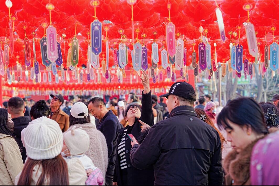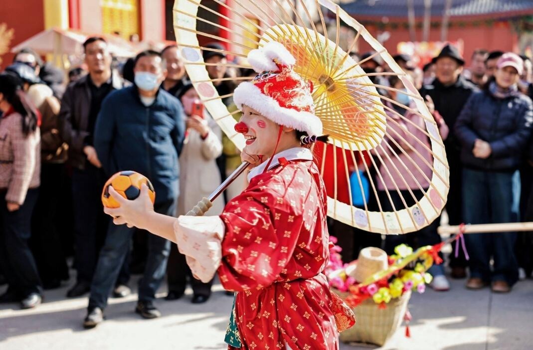走进玉皇阁景区主会场,古建与民俗相映成趣,热闹气息扑面而来。非遗市集摊位前人头攒动,剪纸、刺绣、面塑、泥哇呜等本土非遗项目集中亮相,传承人现场演示、手把手教学,市民驻足围观、动手体验,在指尖流转间感受传统技艺的精妙。非遗潮秀舞台上,小模特身着融入剪纸元素的服饰灵动走秀,传统手艺与时尚潮流巧妙融合;碑亭二楼,飞天造型古典舞翩跹起舞,衣袂飘飘与古建风韵相得益彰。川剧变脸、相声、杂技、魔术等民俗节目轮番登场,卖货郎、杂耍演员穿行巡游,与游客趣味互动。猜灯谜、投壶、捞元宵等传统游戏前排起长队,电子灯谜与传统灯谜相结合,融入马年民俗与平罗本土元素,老少同乐、趣味十足。