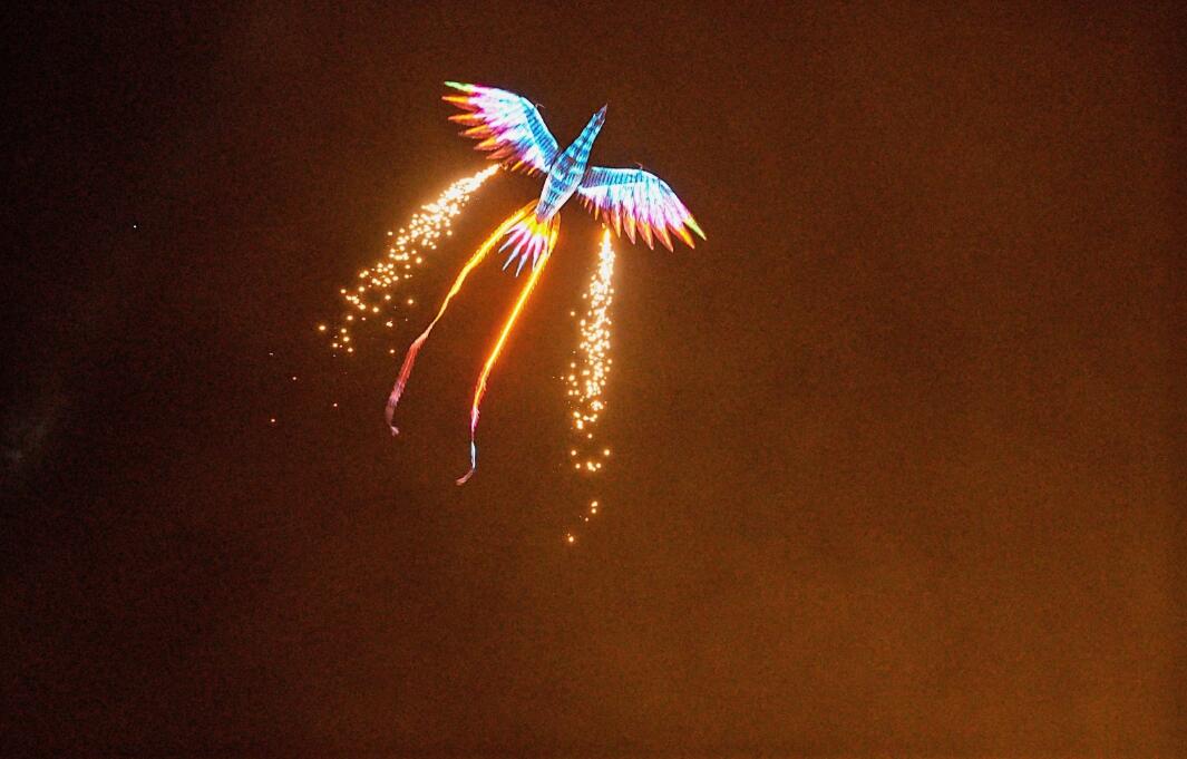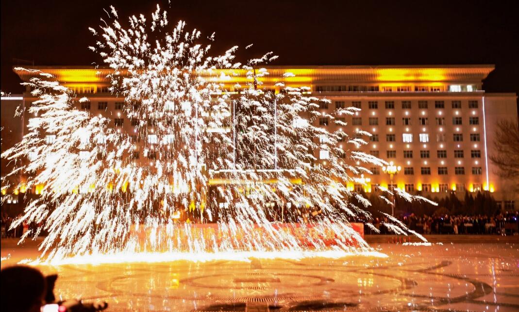 夜幕降临,华灯初上,震撼的视觉盛宴接续上演。两只6米长的灯光凤凰模型腾空而起,围绕玉皇阁、汇融商圈等核心区域高空巡游,翅膀流光溢彩,搭配定制音效,“天鸟送福”的奇观引得市民纷纷抬头观望、拍照留念。县政府大楼前广场,舞龙舞狮热场后,打铁花、风火轮、火壶、喷火等火艺表演惊艳亮相,滚烫铁水腾空挥洒,化作漫天金雨,火树银花点亮夜空,绚烂光影间,观众阵阵惊呼,用手机定格这一震撼瞬间。