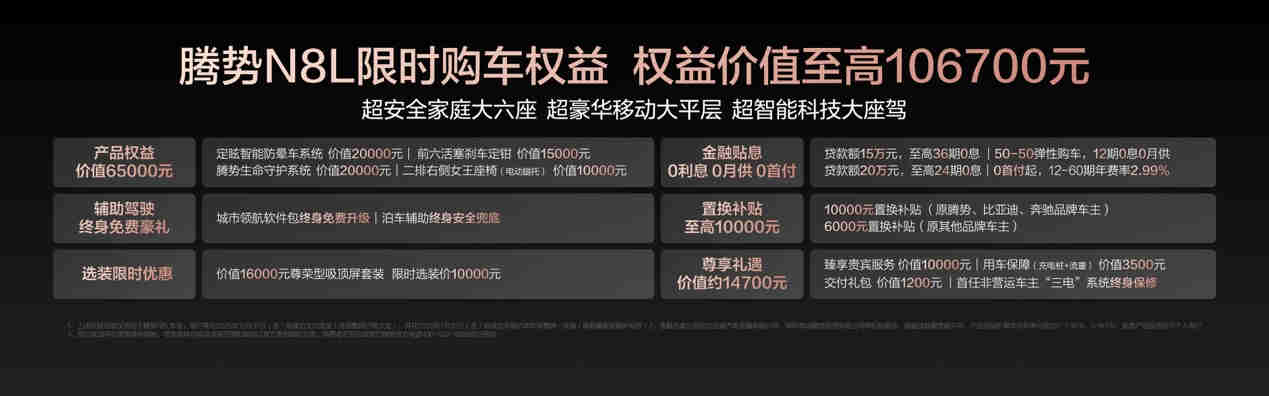 腾势N8L售价为29.98万元-32.98万元,上市以来持续热销,为回馈用户厚爱,推出限时购车权益,价值最高达10.67万元!包括价值1.7万元的三年免息,最高1万元的置换补贴。此外,在2025年11月30日24点前完成合同签署的用户,如果因非用户原因车辆未及时交付,导致开票实际发生在2026年,可享受购置税差额补贴,最高1.5万元!用户不必担心因为交车晚,而享受不到购置税补贴。