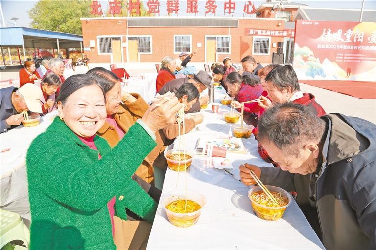 10月28日,在贺兰县洪广镇北庙村幸福大院里,老人们享用长寿面。 宁夏日报报业集团全媒体记者 王若英 摄