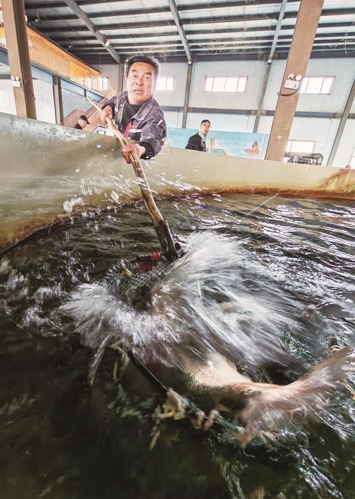 “咔嗒”一声响,23岁的安娜拉开宁夏蓝湾生态农业有限公司“海鱼陆养”养殖车间大门,一股雾气瞬间包裹了她。初冬的阳光穿透水雾,洒在鲈鱼养殖池的水面上。安娜和姑妈安莲熟练地抄起两根1米多长的捞网,探下水面,迅速而准确地捞起4条60多厘米长的鲈鱼。网里的鲈鱼“扑棱棱”翻滚,飞溅起串串水珠,弹落在养殖池里,在阳光下折射出七彩的光泽。