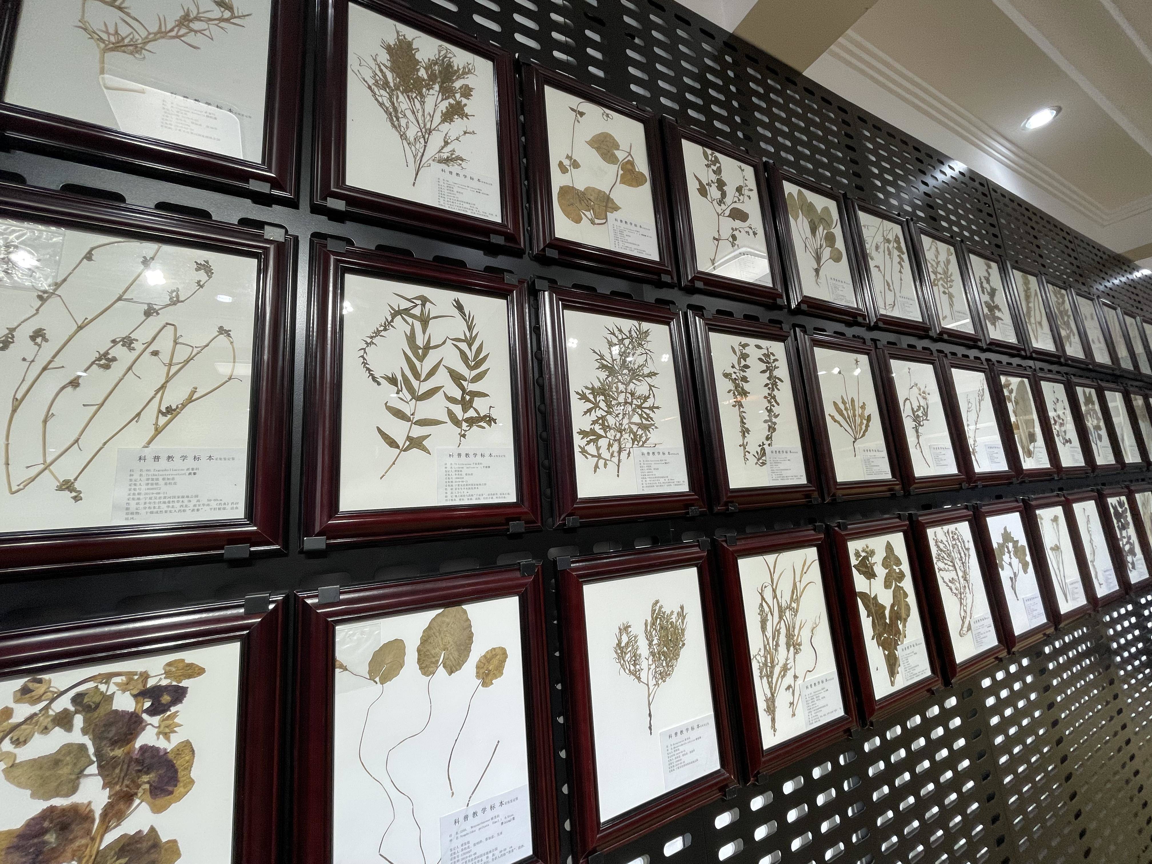 在吴忠市湿地管理中心展示厅的一个墙面展示柜中,有许多生物标本。