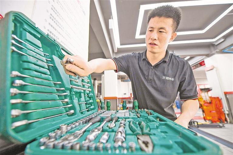 9月19日正午时分,银川市金凤区天猫养车(丽园南区店)维修车间内,靳富云正蹲在一辆私家车旁,目光紧紧锁定在底盘零件上,手中的扳手飞速而稳健地转动着。