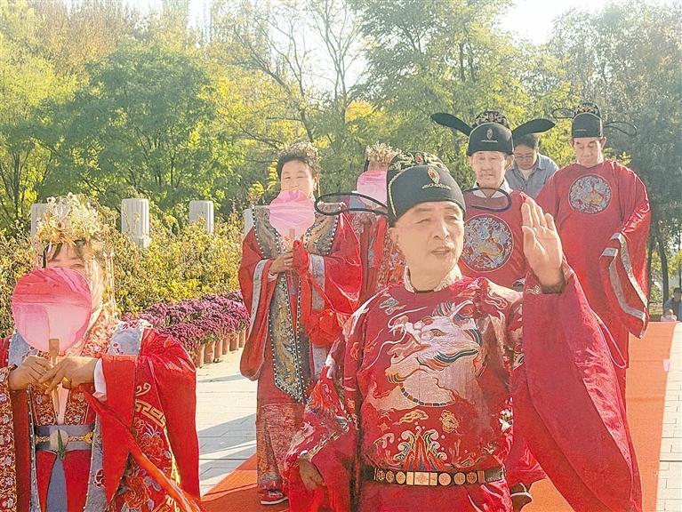 10月28日,由自治区民政厅、银川市民政局和西夏区民政局共同主办的“致敬银龄爱情,传递民生温情”重阳节集体婚礼在西夏区新时代文明实践中心广场举行,八对老年夫妇身着传统礼服,重温婚礼的美好时刻。记者 贺紫瑞 摄