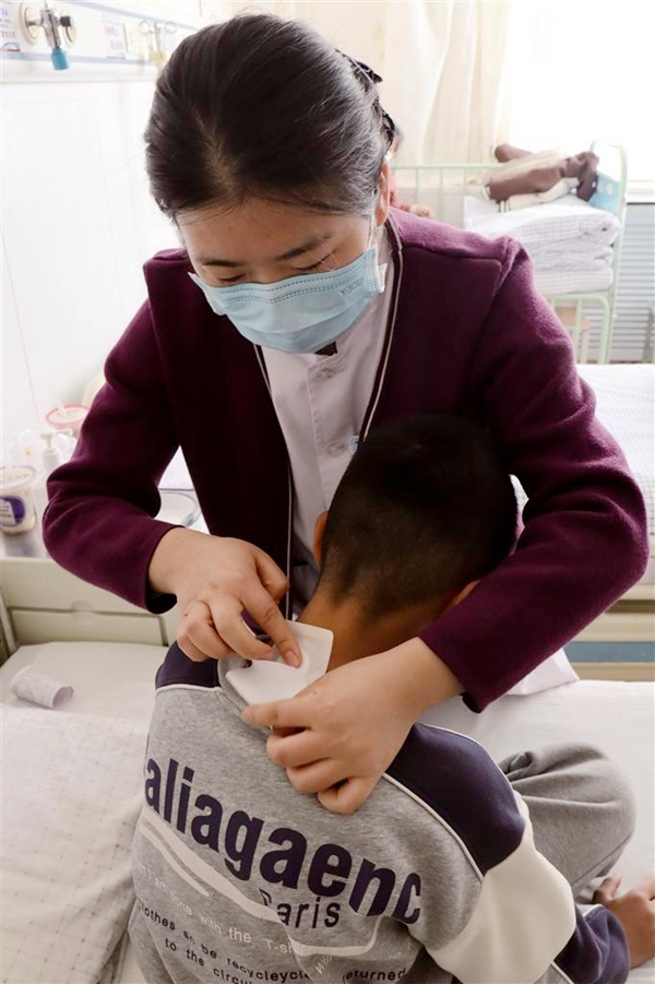 宁夏中西医结合医院儿科护士给患者贴中药方。