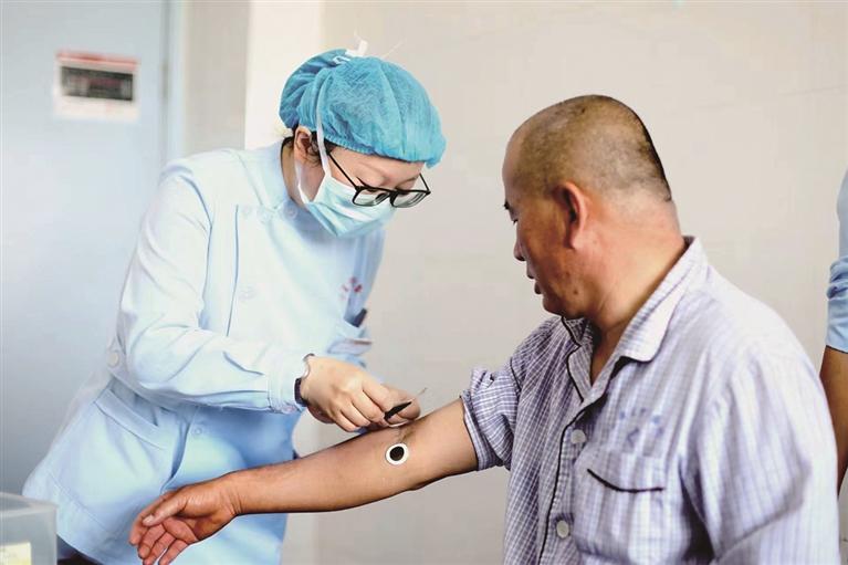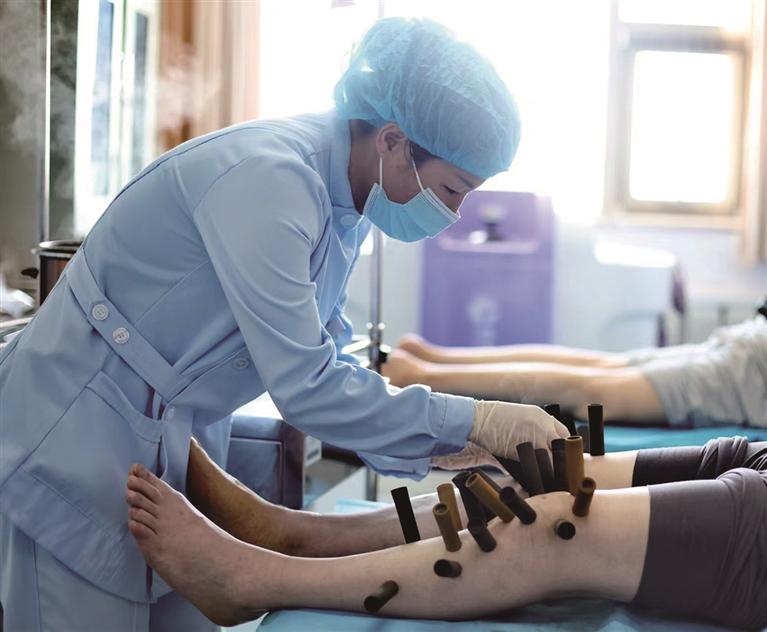 在自治区中医医院暨中医研究院风湿病科,医护人员为患者做药物竹罐治疗。