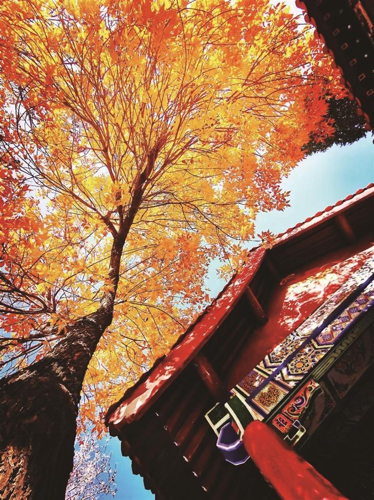 漫步银川中山公园,两条主干道上是成排的毛白杨,阳光透过层层叠叠的树叶洒落在路面上,光影斑驳陆离,挺拔的树干、茂盛的枝叶,如同忠诚的卫士守护着这里。文昌阁边,几棵金灿灿的古树依偎在红色的屋檐下,古色生香。3个人才能合抱的百年老槐树下,是跳广场舞的欢乐人群。