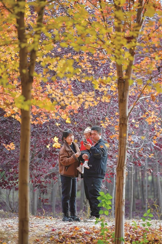 “凤凰公园秋景最佳观赏期集中在10月中下旬至11月中下旬,届时,‘黄金隧道’贯穿公园东南西北,树叶落在3条红色大道上,红黄映衬,踩在厚厚的树叶上,十分惬意。”凤凰公园养护人员侯波介绍,凤凰公园和德馨公园刚建成时,只是个“大苗圃”,里面粗放地栽种着一些花草树木,连最基本的路网都没有。随着公园绿地提档升级速度加快,两座公园道路完善,各类基础设施配齐,还引入了各种观赏价值高的植物。一入秋,新疆杨、白蜡、黄栌、红枫等几十种树木的树叶红黄交错,公园内成了天然“大氧吧”,曾经的“大苗圃”也成了网红打卡地,每个周末都能吸引众多游客和市民前来观赏。