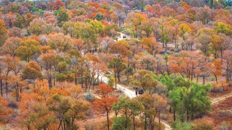 10月22日,银川凤凰公园的新疆杨树叶绿中泛黄,正酝酿着一场属于秋日的金色浪漫。