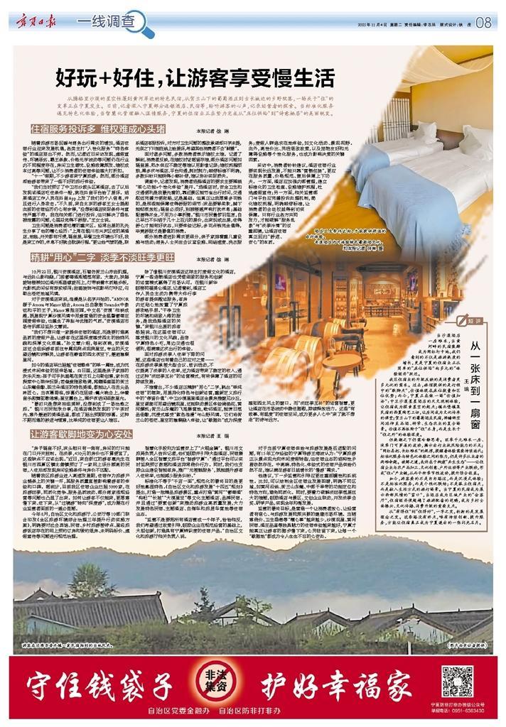从“有得住”到“住得好”,一字之变,折射的是发展理念之变。这条路没有终点,唯有持续创新、提升服务,方能让住宿真正成为宁夏递出的一张闪光名片。(王 瑞)