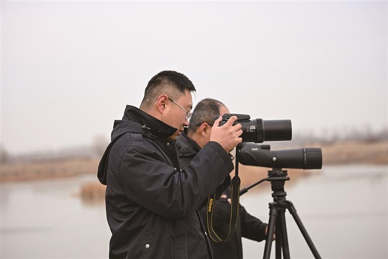 工作人员观测候鸟。