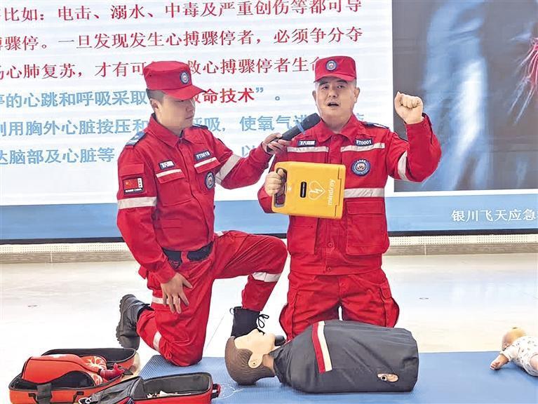 赫永海(右)和队员们深入各单位讲解专业急救知识。 (图片由受访单位提供)