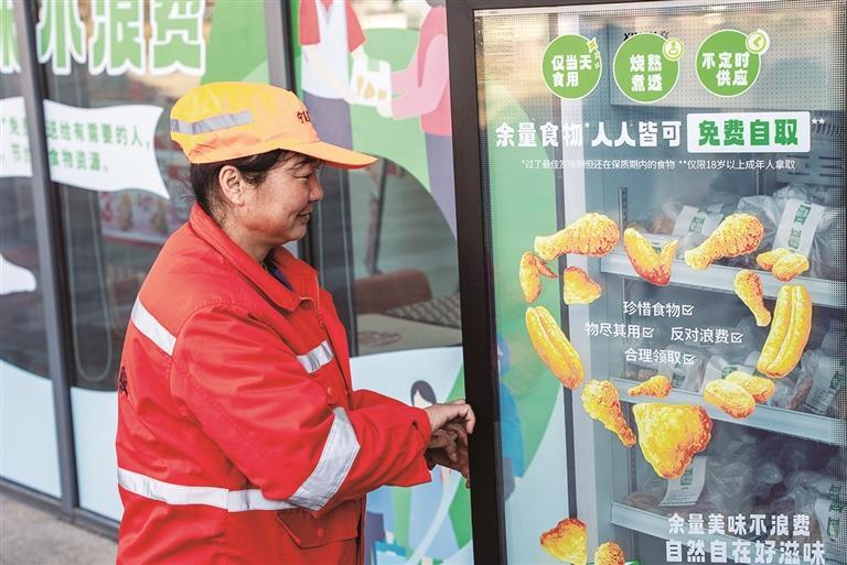 环卫工人从“食物驿站”专属冰柜中领取“余量食物”礼包。