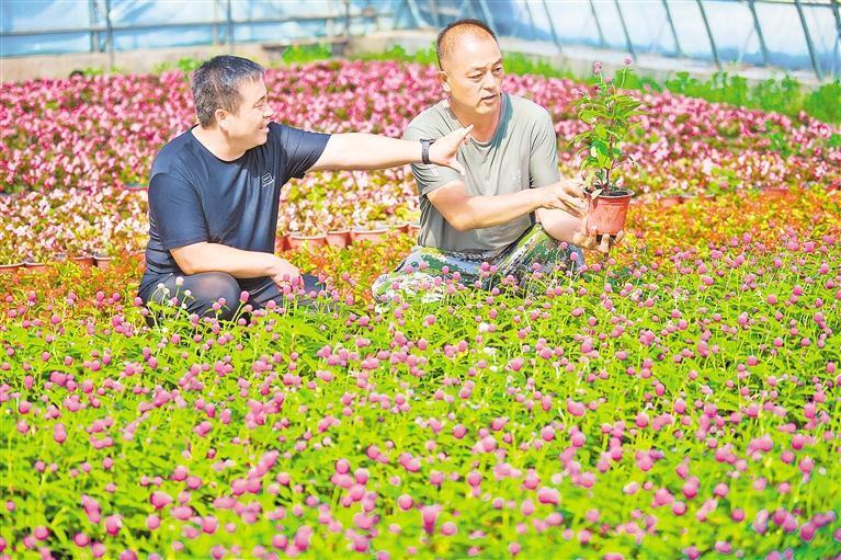 孙永平(右)和同事查看草花的长势和品质。(图片由受访者提供)