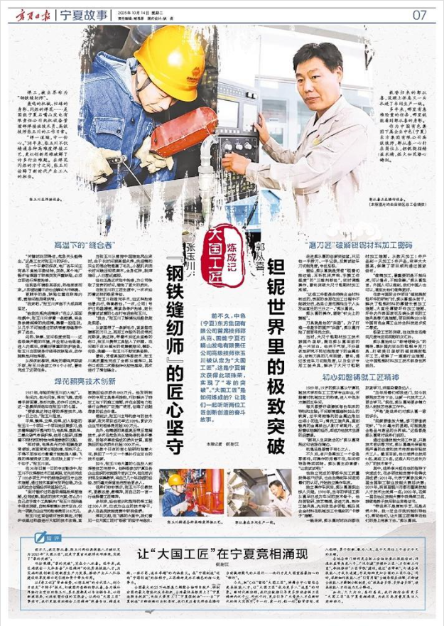 前不久,我区郭从喜、张玉川两位高技能人才被认定为2025年“大国工匠”,这是宁夏首次获得此项殊荣,实现了“零的突破”。