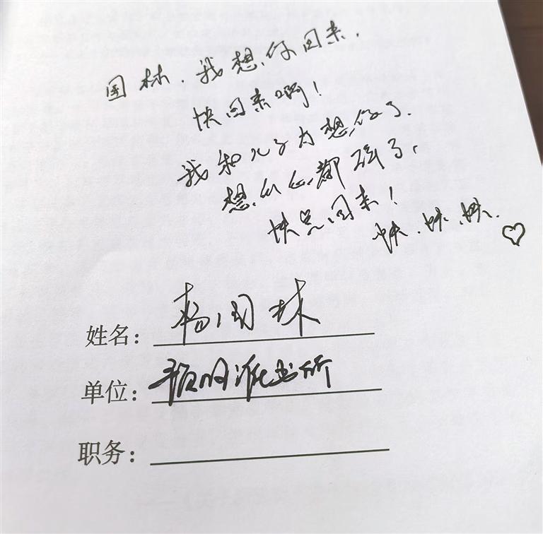 预旺派出所的办公室里,杨国林办公桌上的笔记本码得整整齐齐,翻开扉页,几行娟秀却带着颤抖的字迹刺得人眼睛发涩:“国林,我想你回来。回来啊!我和儿子太想你了,想得心都碎了,快点回来!快快快。”