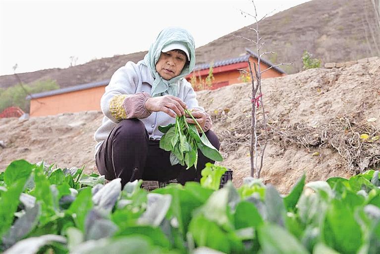 沈家河版画创作者李丽荣在自家门前的菜地里摘菜。记者 郭小立 摄
