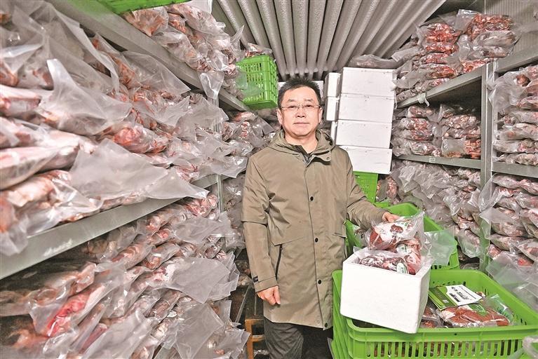 1月7日,在银川峻新家庭农牧场的实体店里,49岁的马自军正与邮政快递员交接一批即将发往区外的精品羊肉。