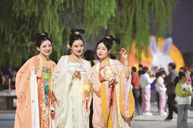 华灯初上,社区广场上,一群身着汉服、青春洋溢的少女,手里提着兔子形状、月亮形状的灯笼,笑靥如花。