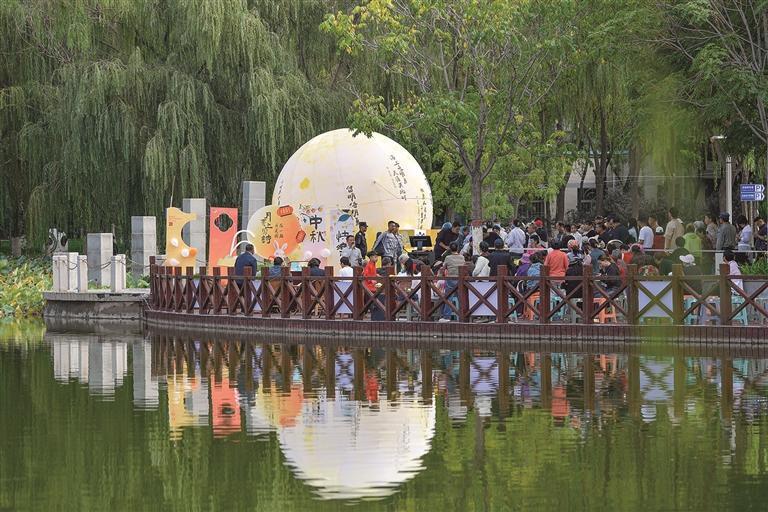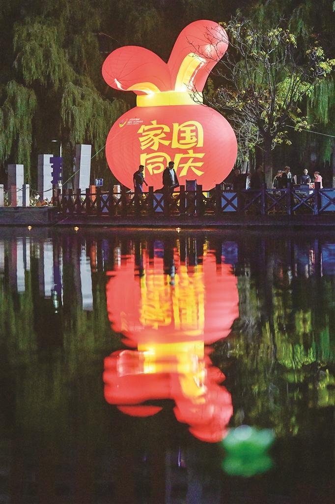 说话间,就来到了中秋晚会主会场前,颜淑勇停下脚步,仰头看着4米多高、印着“家国同庆”字样的充气红色大兔子。“每年中秋晚会,社区都有不一样的创意,去年在燕鸽湖面上布置了1个充气‘满月’,晚上灯光一打,‘满月’反射出淡黄色的光晕,好看极了。”