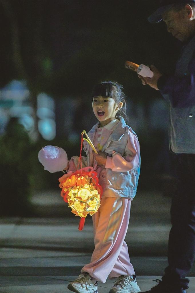 燕鸽湖社区居民身着古装提着花灯赏月。