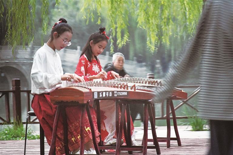 76岁的刘玉田坐在燕鸽湖边的藤椅上,乐呵呵地看着观景台中间调试古筝弦的小演员,微风轻拂过脸庞,带着一丝丝清凉,令人心旷神怡。远处,红嘴鸥在湖上嬉戏觅食,广场上人来人往热闹非凡,构成了一幅人与自然和谐共生的秋日画卷。