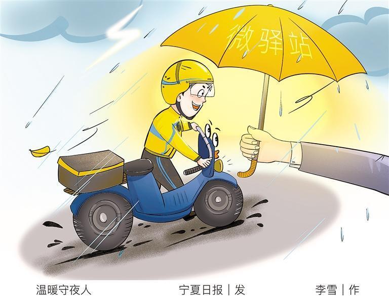 这束光的亮度,是用脚步和耐心“调试”出来的。为了让深夜奔波的骑手、环卫工人既能看清路,又不被强光刺到眼,社区干部连续一周深夜蹲守调研,最终定下那束恰到好处的光晕。这盏灯点亮的,不仅有银华社区的微驿站,更开启了敬德商圈的“温暖接力”:周边商户纷纷行动,主动增设充电位、煮制免费姜茶、备好维修工具,让驿站成了劳动者遮风挡雨的“歇脚地”……如今,这束光已扩散至兴庆区172家微驿站,催生了动人的“温暖回流”——曾经受助的骑手们自发组建应急队,为社区老人代购药品,让善意在城市里实现了双向流动。