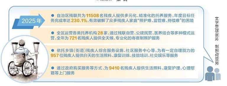 自治区残疾人联合会相关负责人介绍,2025年,我区将残疾人托养服务工作列为重点民生实事项目,通过强化寄宿制托养专业支撑、拓展日间照料社区服务、筑牢居家服务家庭照护本位、创新邻里照护互助模式等举措,搭建起残疾人的保障体系。截至2025年,自治区残联创新推广的困难重度残疾人邻里照护服务项目,已经覆盖22个县(市、区),实现结对帮扶420户,不仅解决了一户多残、以老养残、重残独居等特殊困难家庭的照护“真空”难题,还为照护人员创造了就业岗位,形成“服务一人、解脱一家、增收一户”的多重效益,探索出具有宁夏特色的残疾人托养服务模式。(记者 张涛)