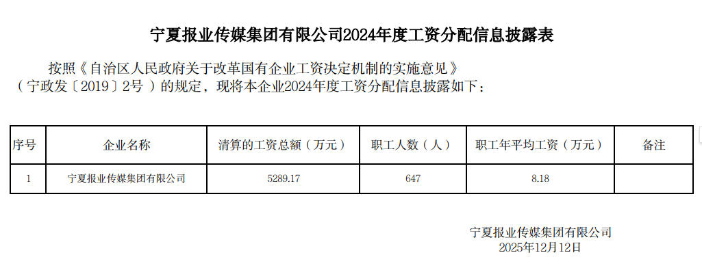 宁夏报业传媒集团有限公司2024年度工资分配信息披露表