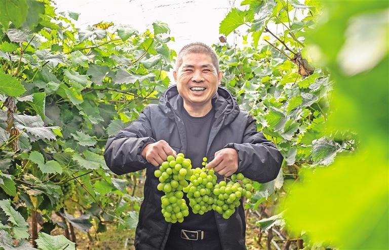 11月18日,初冬时节,中卫市沙坡头区东园镇赵桥村,种植大户曹高善展示着蔬菜大棚里即将上市的葡萄。近年来,沙坡头区致力于打造高品质的“四好”设施农业园区,推动农业现代化发展,向时间和空间要效益,农业综合生产能力得到有效提升。 宁夏日报报业集团全媒体见习记者 王强 摄
