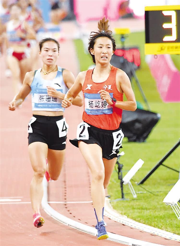3000米障碍赛决赛中,杨屹婷(前)全力冲刺。