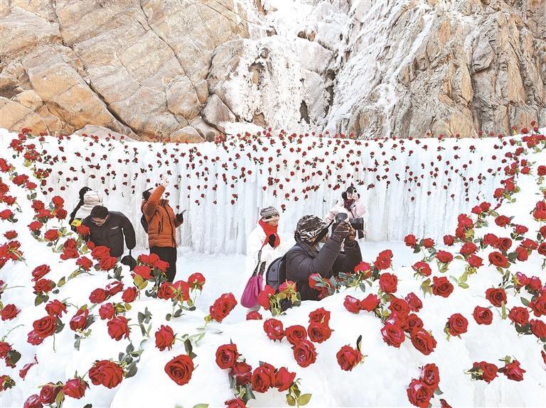 1月10日,贺兰山岩画景区第四届冰峰节启幕。古老岩画与冰雪创意融合,创新冬季文旅消费场景。近年来,银川着力破解旅游“半年闲”瓶颈,推动冬季“冷资源”持续转化为“热效应”,激活冬季文旅消费市场。图为游客在景区“冰雪玫瑰”打卡。 记者 王刚 摄