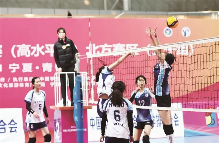 12月3日,2025—2026中国大学生排球联赛(高水平组)北方赛区(女子组)的比赛在青铜峡市黄河奥体中心开幕,来自北京体育大学、西北师范大学等学校的13支女子排球队、200余名运动员展开激烈角逐。揭幕战中,延边大学队以3比1力克沈阳体育学院队,兰州大学队以3比0战胜西北师范大学队。(记者 高晓刚 摄)