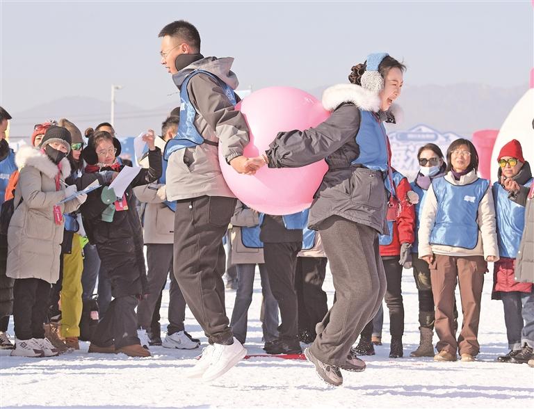 12月27日,在银川阅海滑雪场举行的千人冰雪趣味运动会上,游客参加蛟龙竞速、雪地拔河、运球接力等雪地运动项目。据悉,2025—2026冰雪季,银川市将举办近50项冬季体育赛事活动。 宁夏日报报业集团全媒体记者 高晓刚 摄