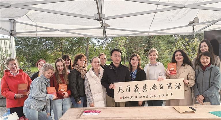 张学东(中)在俄罗斯举办读者交流活动。受访者供图