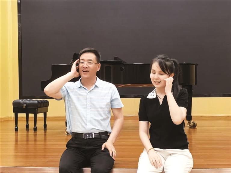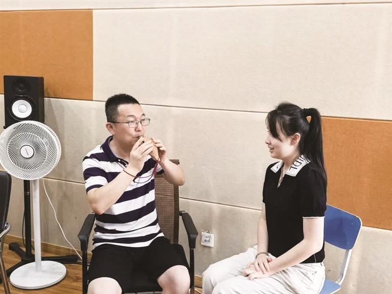 马奕菲向宁夏师范大学郅勇教授学习“泥哇呜”演奏技巧。