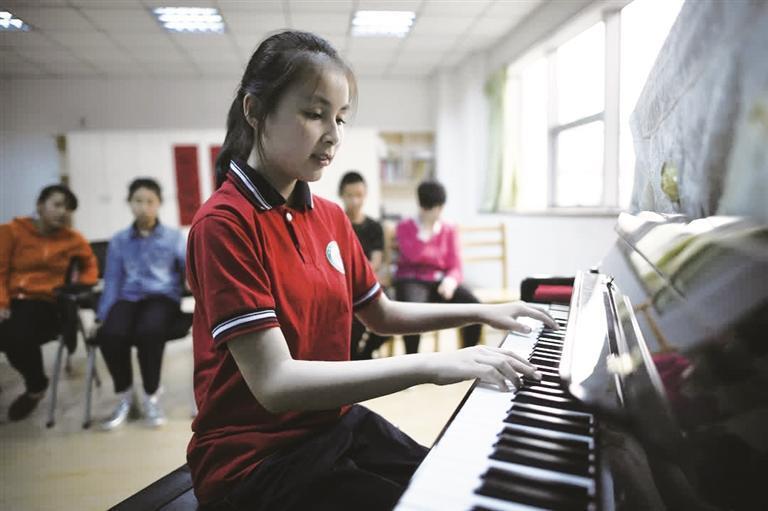 马奕菲在宁夏特殊教育学校演奏钢琴。