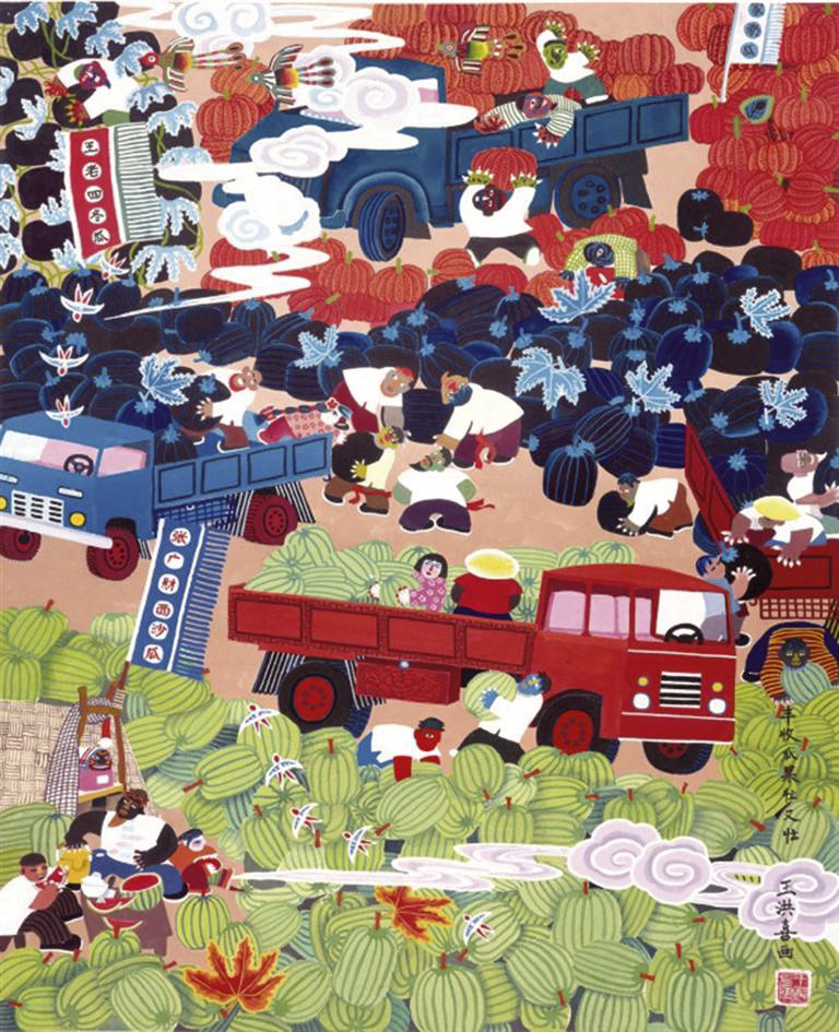 创作的源泉就此打开。“我本身就是农民,见得最多、感情最深的就是农家日子,要画,就画农家的画。”自此,王洪喜的画笔下,都是他见得最多、了解最深、感情最真的乡间印象。