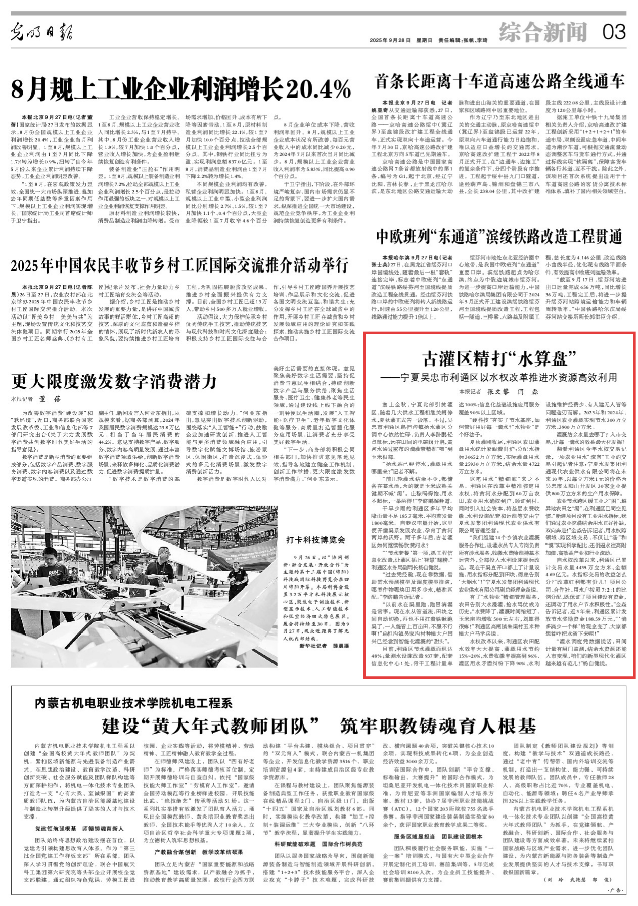 农业节水跨区缓工业之“困”、解异地农田之“渴”,在利通区已司空见惯。“新建项目没有工业用水指标,我们通过农业挖潜结余用水正好补缺,双向奔赴!”金焱告诉记者,用水权跨领域、跨区域交易,不仅让“汤”和“馍”实现科学配比,还倒逼水往高附加值、高效益产业和行业流动。