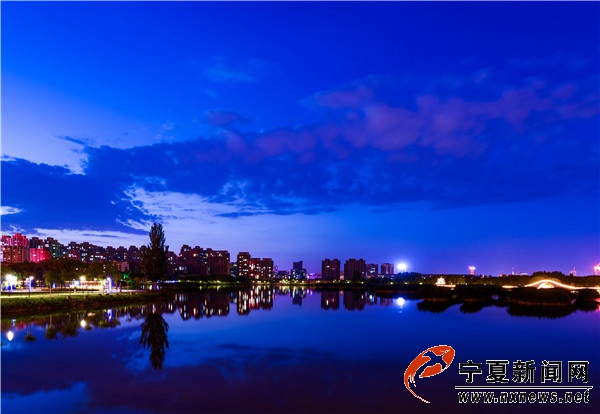 6月9日晚,银川灯光璀璨夜色撩人,在湛蓝的天空下,湖边的建筑与平静的湖水交相呼应,美不胜收。 宁夏新闻网记者 祁瀛涛 摄