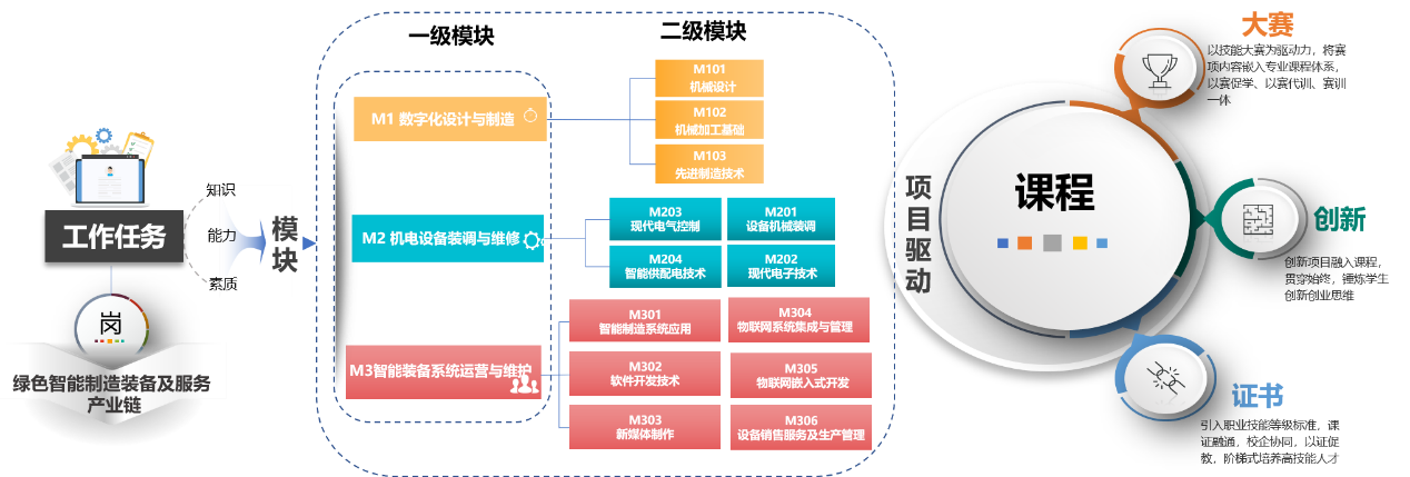 近年来,宁夏职业技术学院机电一体化专业国家级教师教学创新团队围绕高素质技术技能人才培养,联合构建了“岗课赛证创”五维融通模块化课程体系。依据课程开发路径,将职业岗位、项目课程、资格证书、技能竞赛、创新创业五维元素相互融通,以岗定课、以证定标、以证验课、以赛导课、以赛提技、以创拓能。